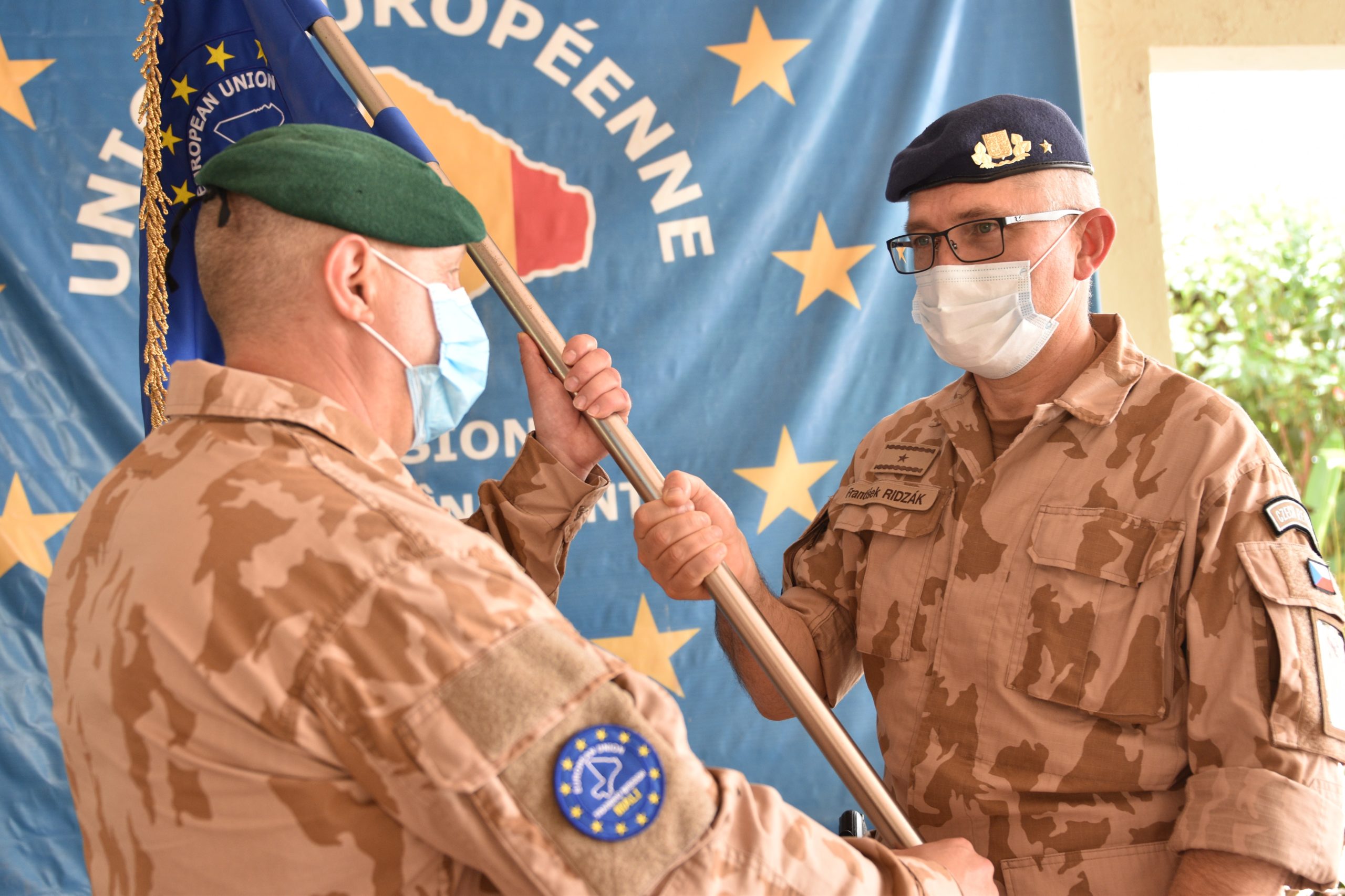 The Change of Command between the outgoing Education and Training Task Force (ETTF) Commander, Colonel Jesus Campuzano Santa Teresa (Spain) and the incoming ETTF Commander, Colonel Martin Botik (Czech Republic) took place on Monday, 15 June 2020, at the Koulikoro Training Centre (KTC). The Change of Command was executed during a formal ceremony with the presence of the EUTM Mali Mission Force Commander (MF Cdr), Brigadier General František Ridzák, the EUTM Mali Deputy MF Cdr, Colonel Antonio Arauzo Martinez and the Commander of the Boubacar Sada Sy Training Centre, Colonel Traoré. All KTC personnel took part in the Ceremony.