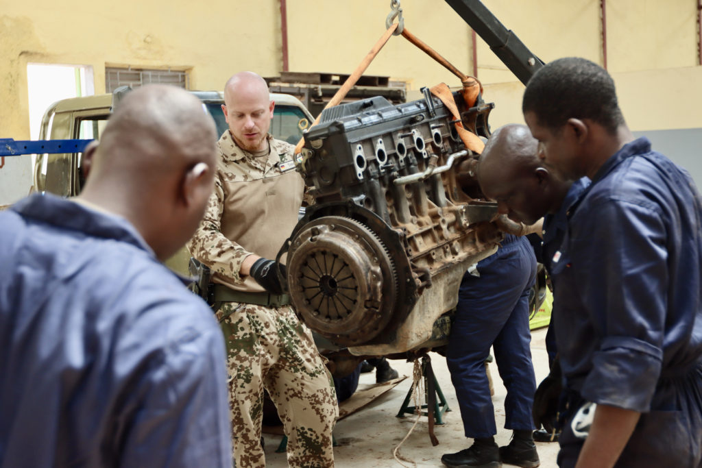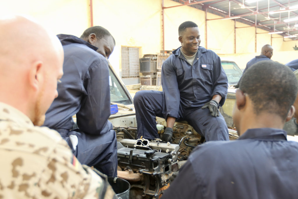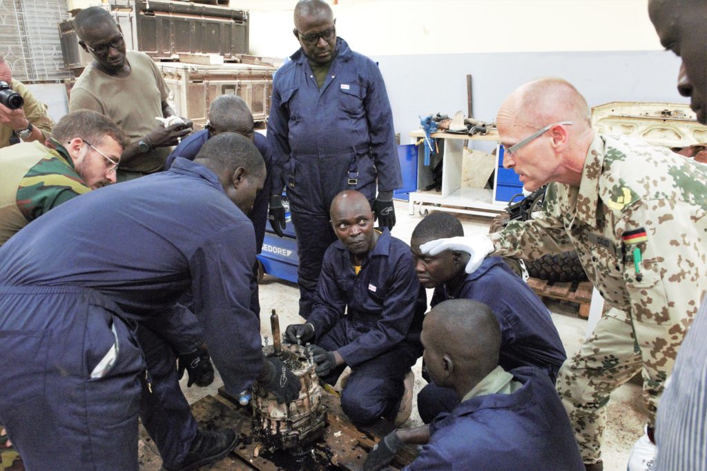L’air pique en ce jour à Kati au 37e régiment des FAMa (Force Armees Malienne). Une dizaine de soldats maliens travaillent dans une humidité élevée dans les nouvelles salles de maintenance construites il y a quelques années à l’initiative de l’armée allemande. Les hommes portent fièrement leurs nouvelles combinaisons bleues et sont concentrés sur leur travail tandis que les instructeurs leur donnent des conseils. Temps de formation à l’EUTM Mali.