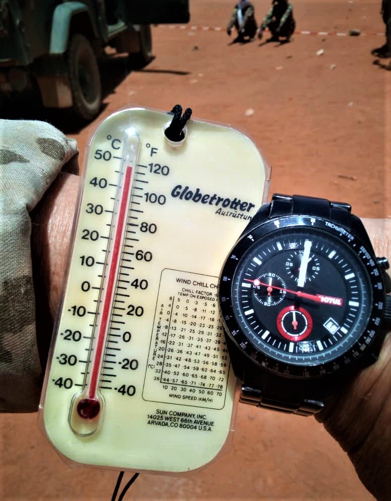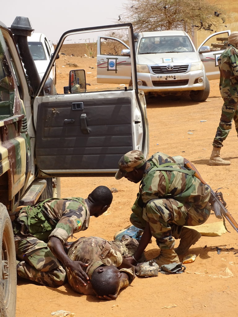 Le personnel de notre équipe de soutien médical “IQARUS” prend son travail au sérieux dans cet environnement, contrôlant constamment les formateurs et les stagiaires. Le “Dr D.” et le paramédic militaire “Mike” rappellent gentiment l’importance de l’hydratation et de la protection solaire. Il est facile de voir qu’ils sont pleinement investis dans leur devoir de soin envers les troupes, et leur sincérité n’est pas perdue pour l’équipe de formation qui les a pleinement assimilés comme faisant partie de la famille EUTM GAO.