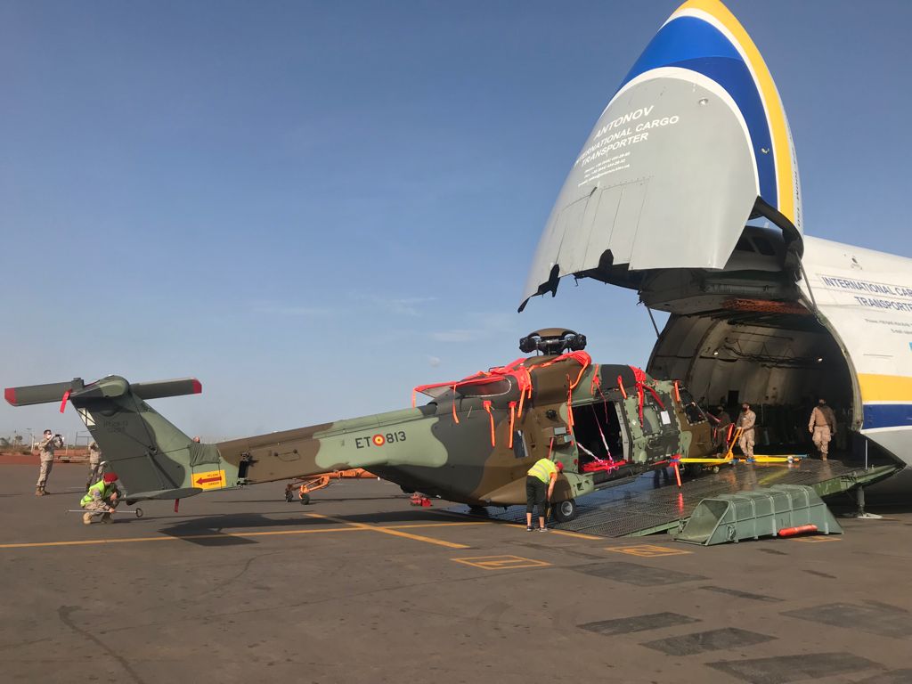 Le Général GRACIA a voulu être le témoin sur place d’un événement aussi important. A l’aéroport, GRACIA a vu le premier NH90 arriver à l’aéroport de Bamako. L’hélicoptère a été partiellement démonté et transporté par un avion Antonov.